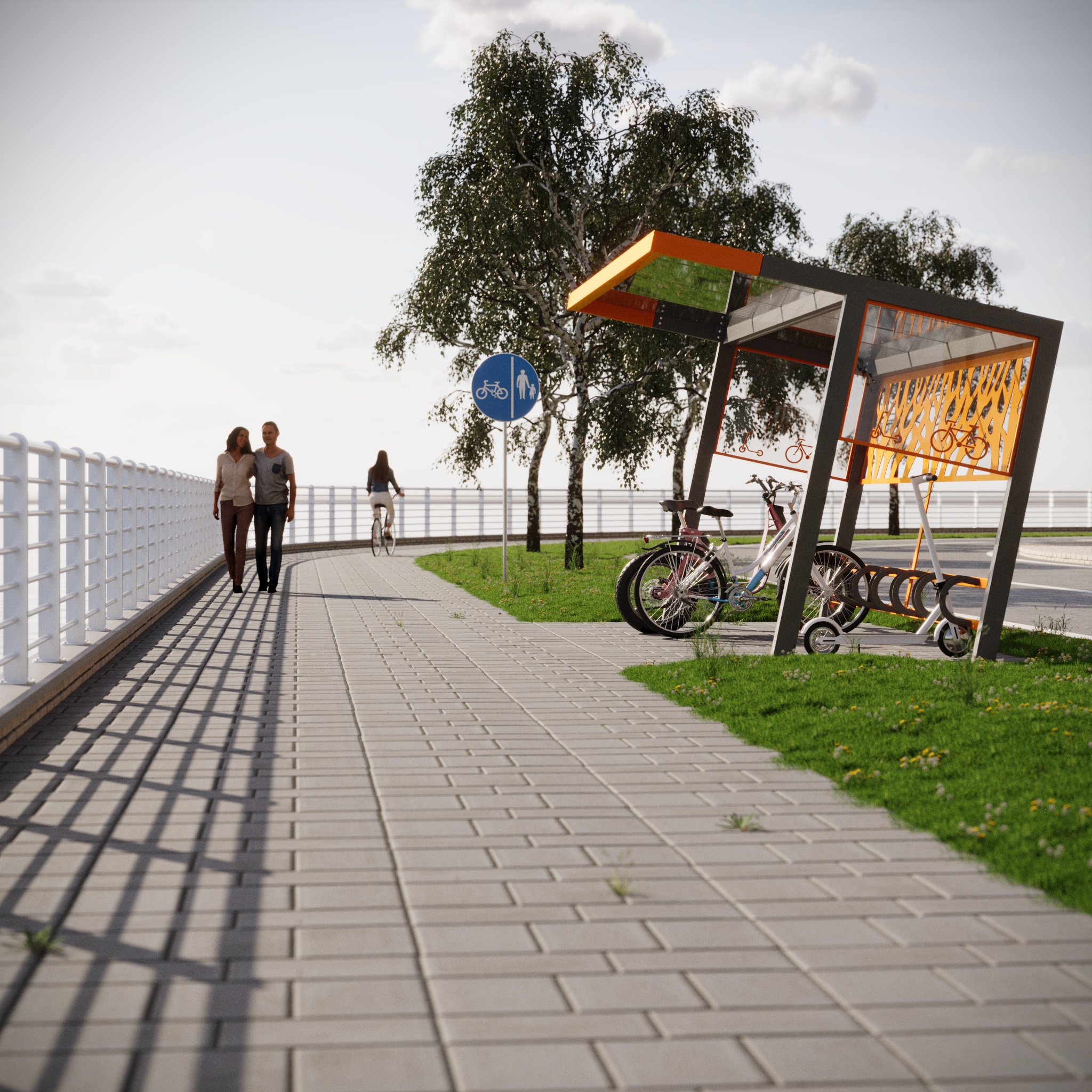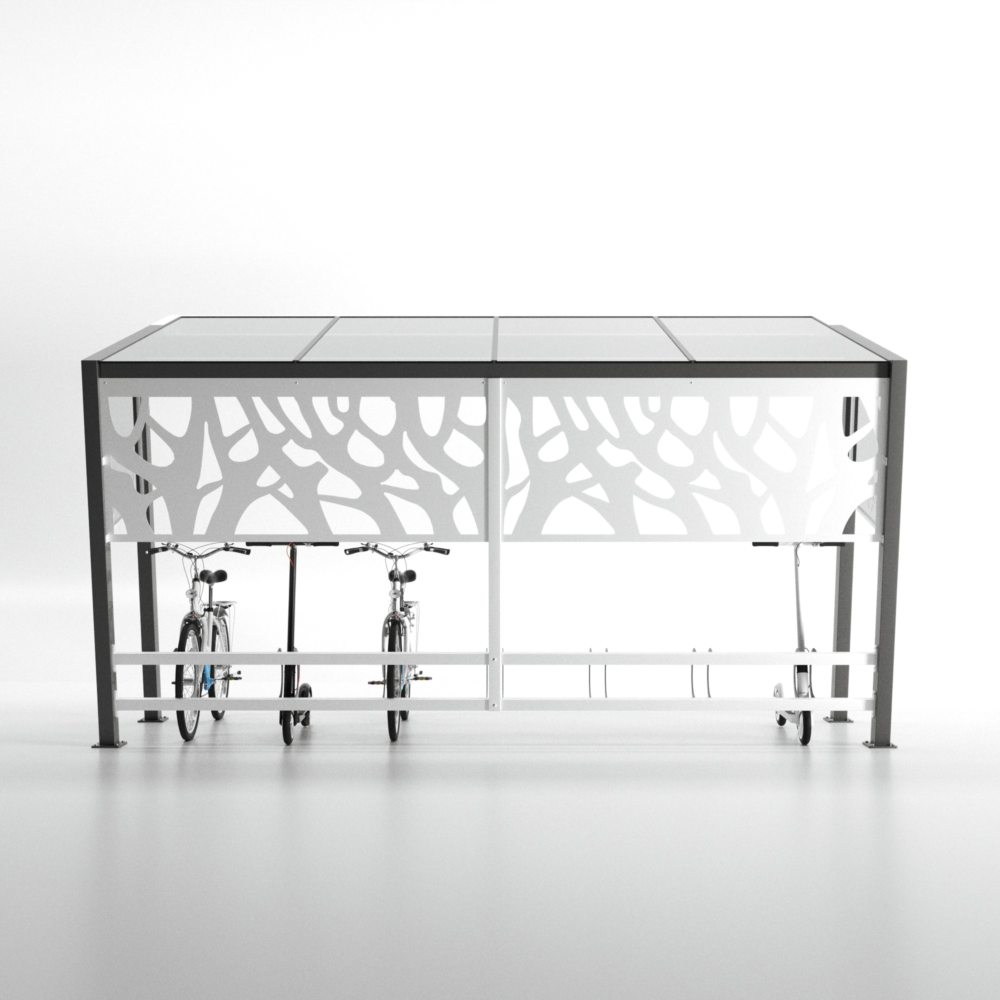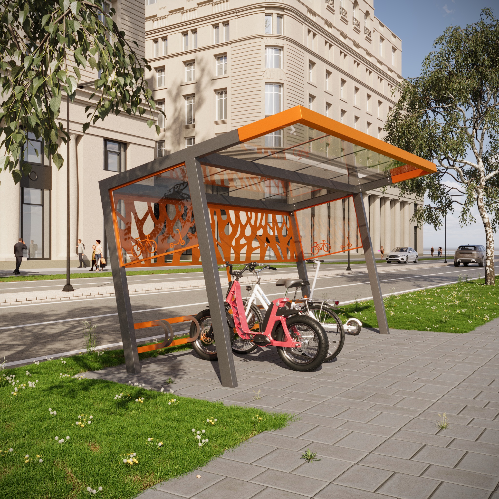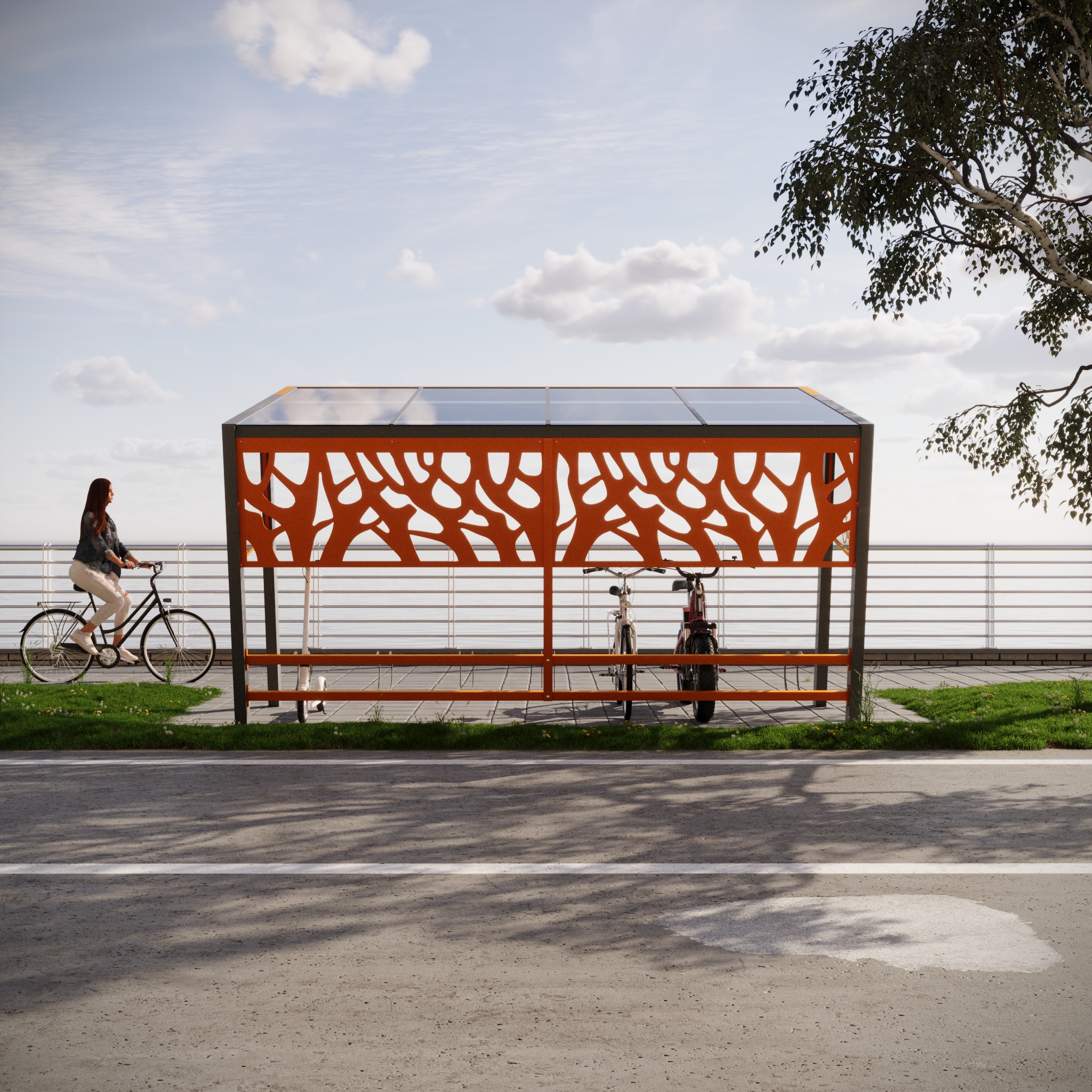 Cross è una pensilina modulare per biciclette e monopattini dal design moderno e minimalista. Caratterizzata da linee semplici e pulite, presenta una robusta struttura in tubolare di acciaio con soffitto in vetro e pannello posteriore a trama naturalistica che crea un interessante contrasto tra l’ambiente urbano e la natura circostante, al fine di integrarsi armoniosamente in qualsiasi contesto.