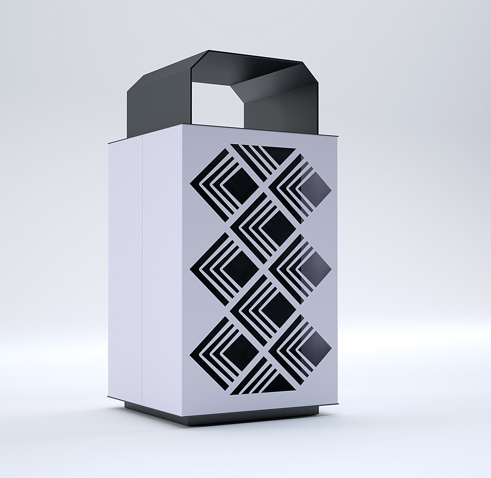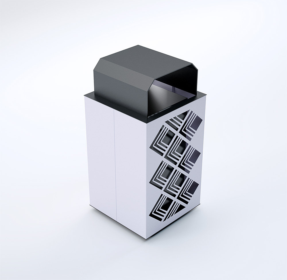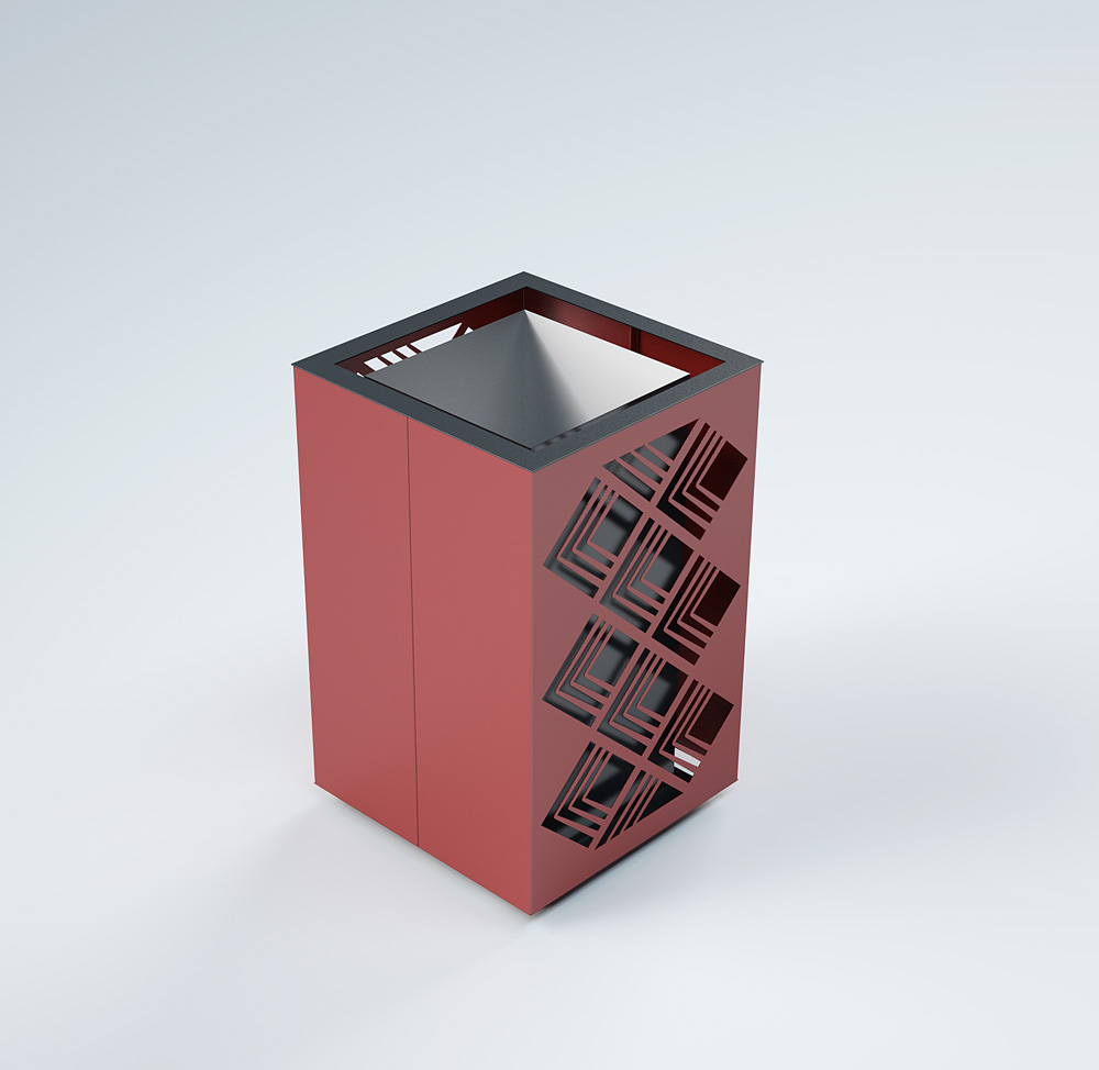 Steel lower base, laser cut, sized mm 482 x 482; there are 2 holes with diameter 14 mm for ground anchoring of the bin.
