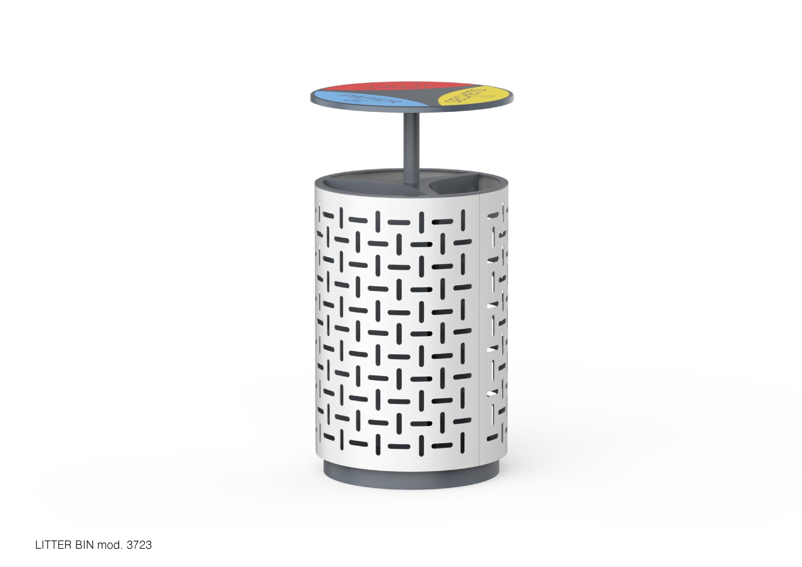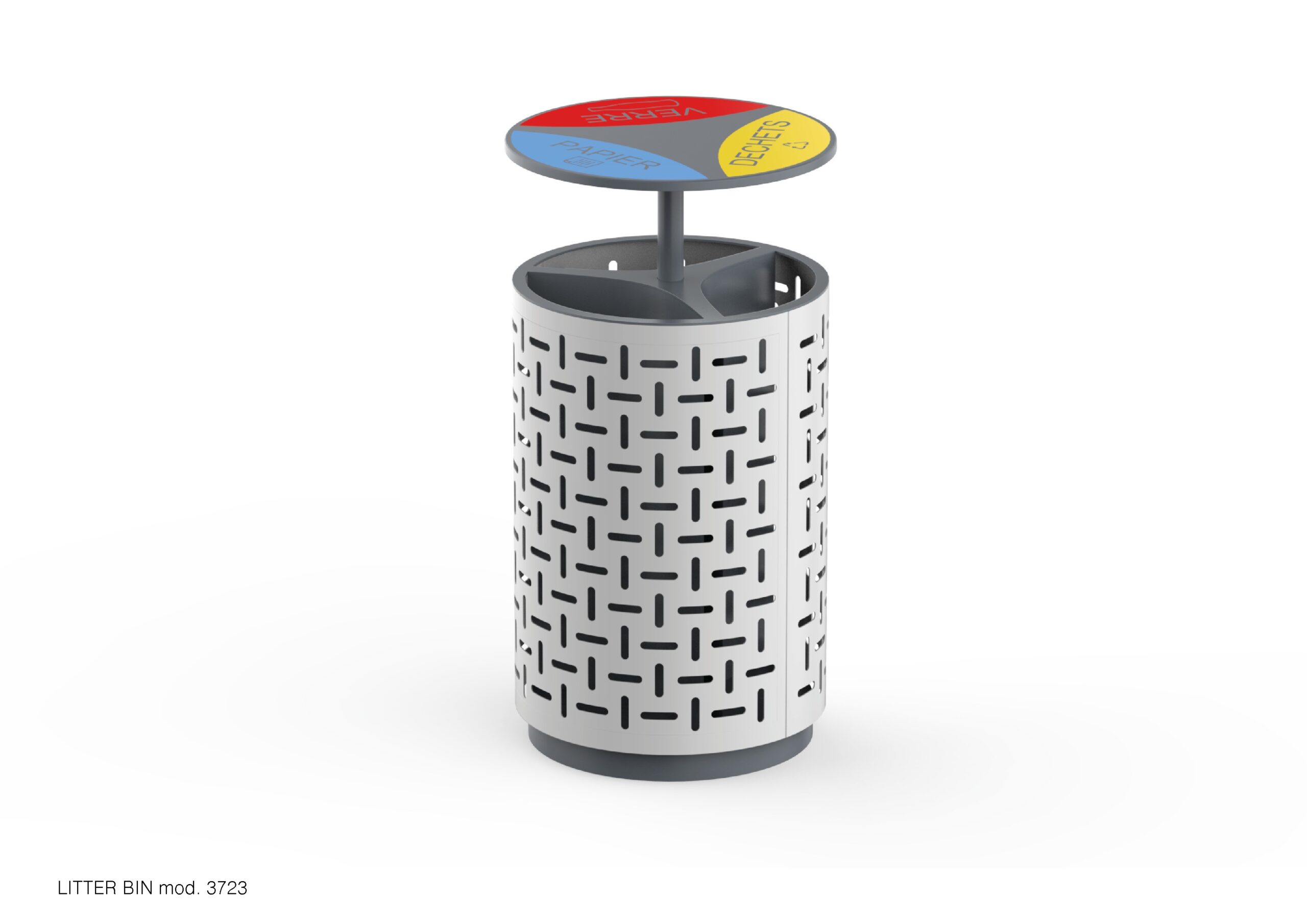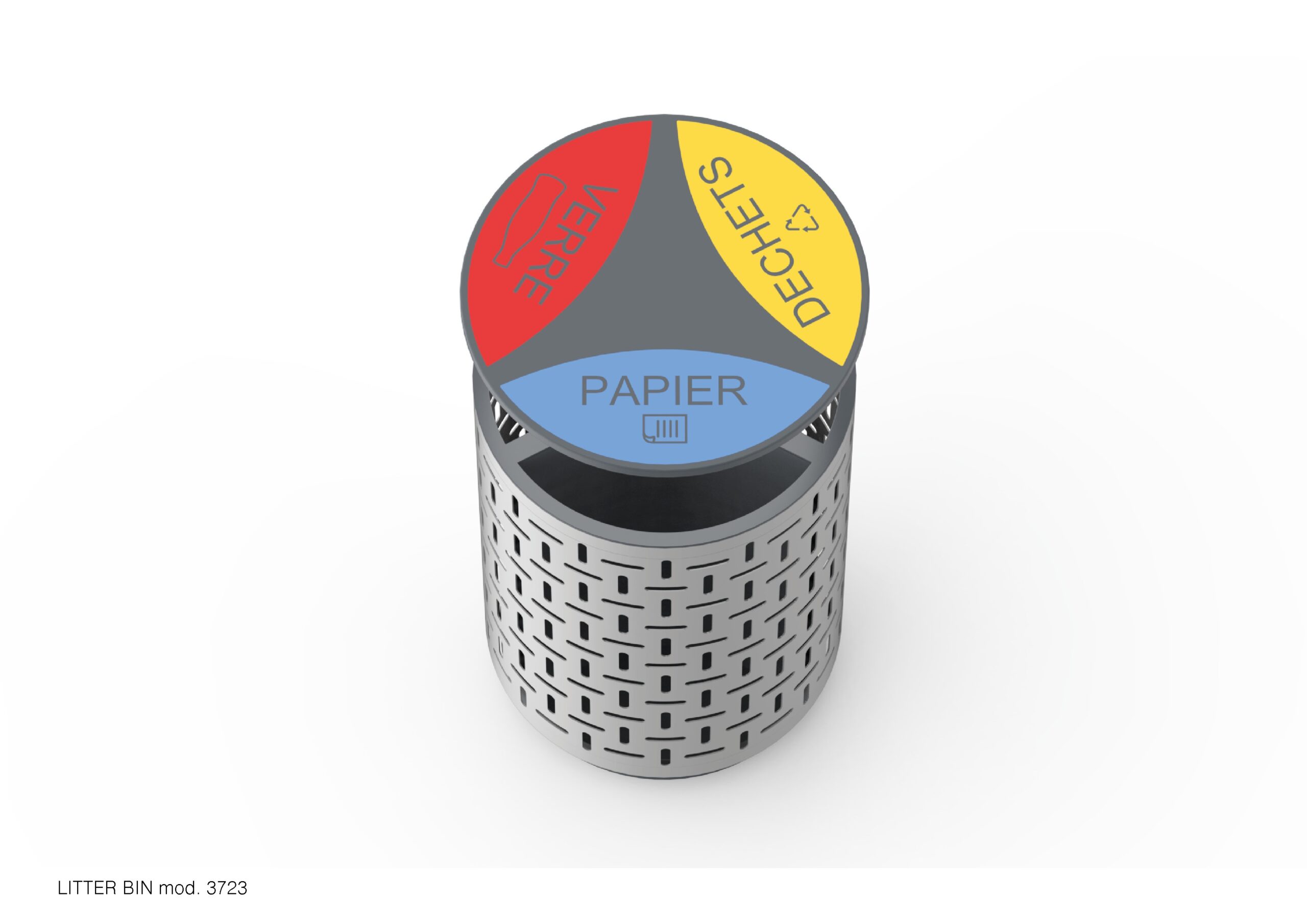 Hinged top lid with three openings for sorting waste; optionally available as a laser-cut steel ashtray. 1 internal bag holder made of 6/10 press-bent galvanised sheet metal. Laser-shaped and calendered base made of galvanized and painted steel. AISI 304 stainless steel screws.
