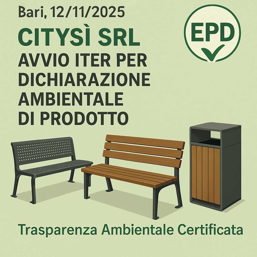 Bari 12/11/2025– Citysì Srl, azienda leader nella produzione di soluzioni per l’arredo urbano, annuncia con orgoglio l’avvio formale dell’iter per ottenere la Dichiarazione Ambientale di Prodotto (EPD) per le sue principali linee di prodotti,acciao, acciao legno, acciaio alluminio effetto legno. Questa iniziativa strategica riafferma l’impegno di Citysì non solo a fornire prodotti di alta qualità,...Leggi di più