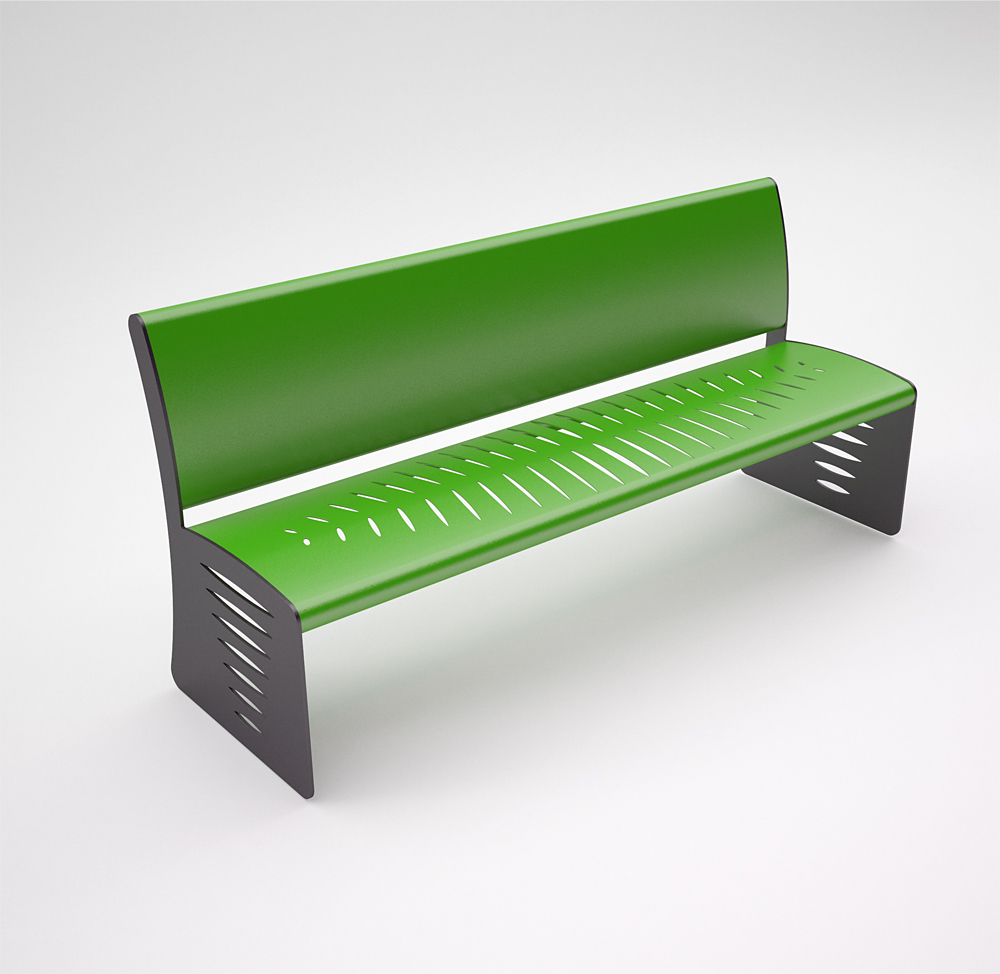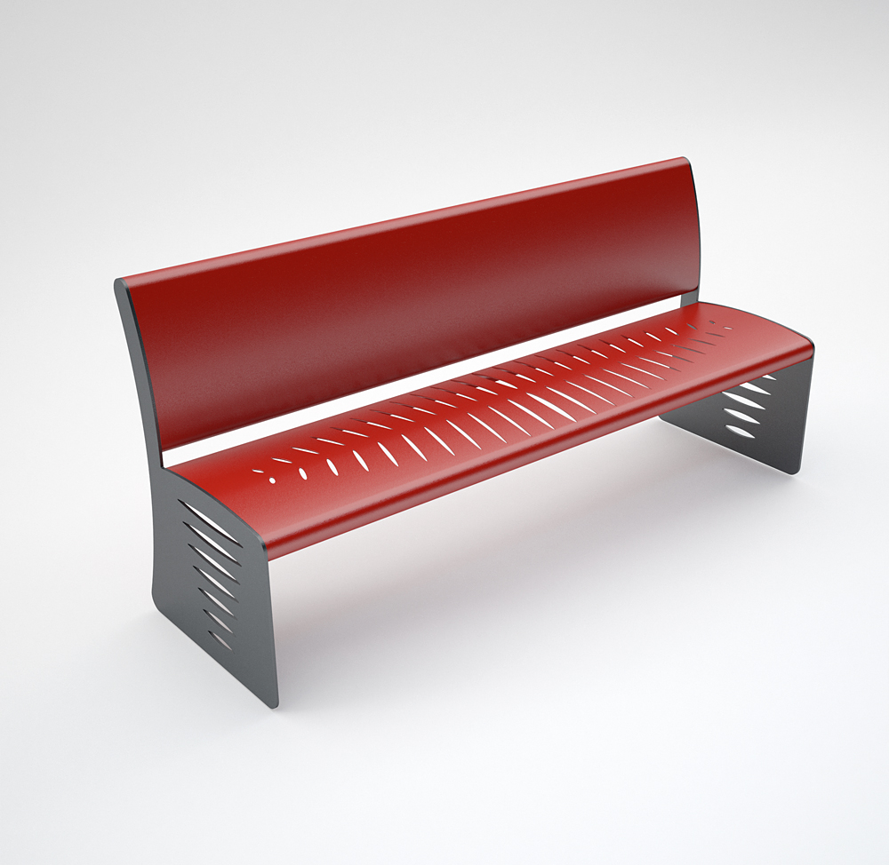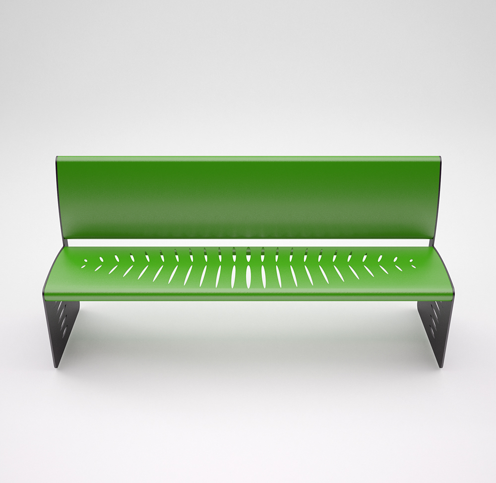 • Struttura portante seduta e schienale in lamiera lasertagliata; i piatti alla base sono dotati di 2 fori ciascuno per il fissaggio a terra della panchina, del diametro di mm 14.