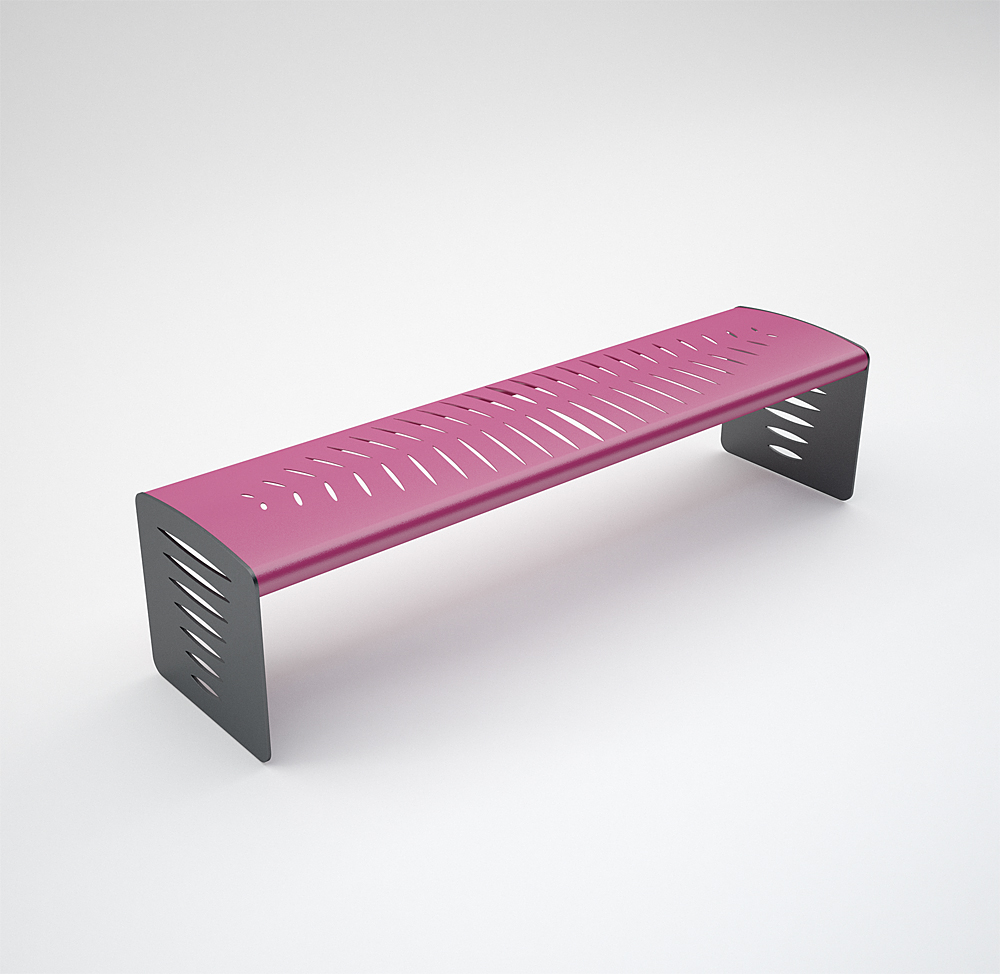 Struttura portante seduta e schienale in lamiera lasertagliata; i piatti alla base sono dotati di 2 fori ciascuno per il fissaggio a terra della panchina, del diametro di mm 14.