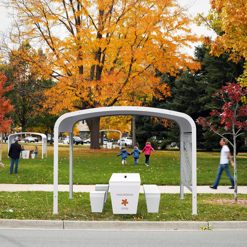 Il progetto Oasi Digitale consiste in un gazebo smart, autoalimentato con dei pannelli solari, che può accogliere fino a sei persone. Fornisce loro, oltre alla postazione di lavoro, anche l’energia elettrica per alimentare i propri laptop.